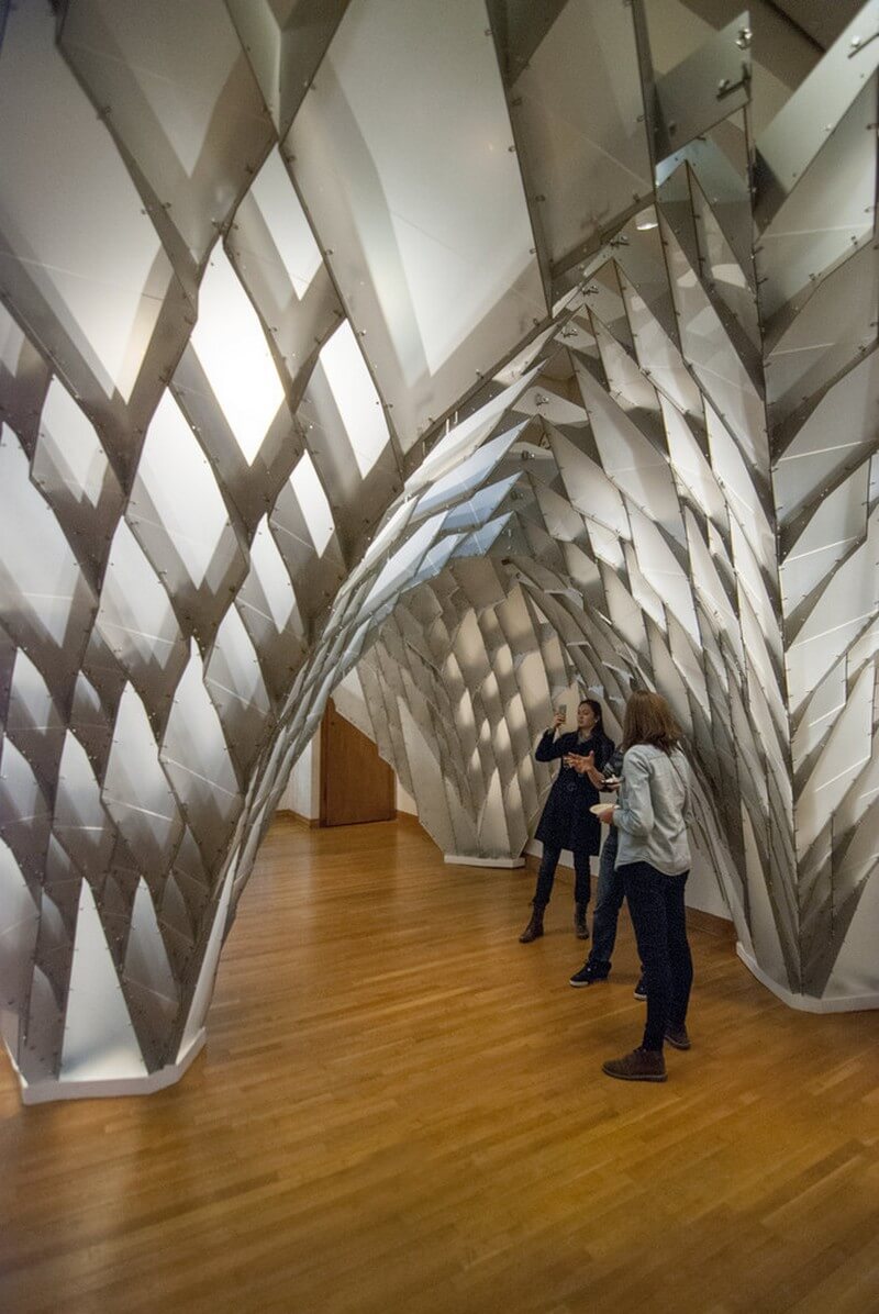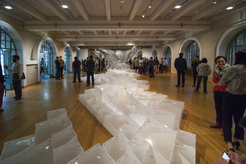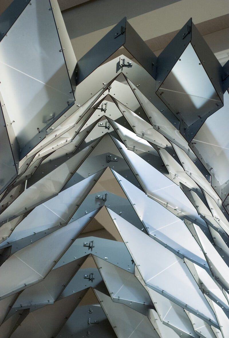 Caret 6 was designed to fill an already existing space, so it was necessary to design a geometry that responded to the existing room, especially at the edges, where the vaulting forms project toward the walls. The asymmetry of the overall form feeds back into each surface via the distribution of secondary and tertiary ribs within each vault, influencing the asymmetrical diamond pattern on the surface.