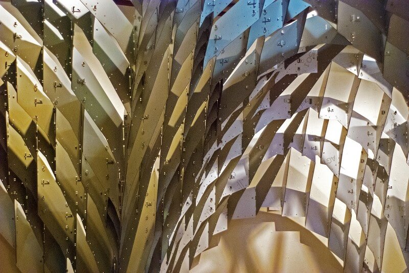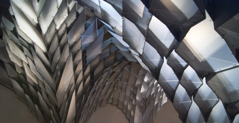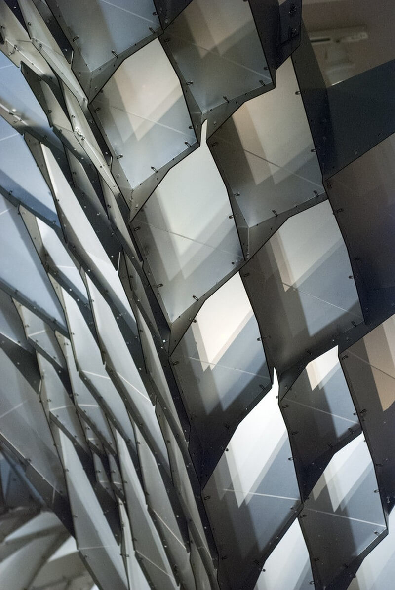 Though the diamond pattern appears to be series of stacked cells, the structure is actually three layers of overlapping ribs. Large, continuous primary ribs form the seams from vault to vault, while secondary ribs span between each seam. Tertiary ribs complete the web and enclose each cell to create a rigid structure.