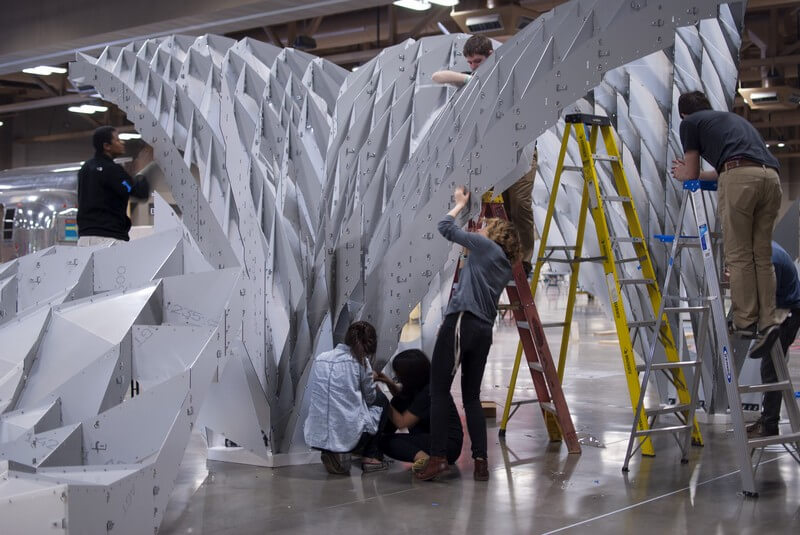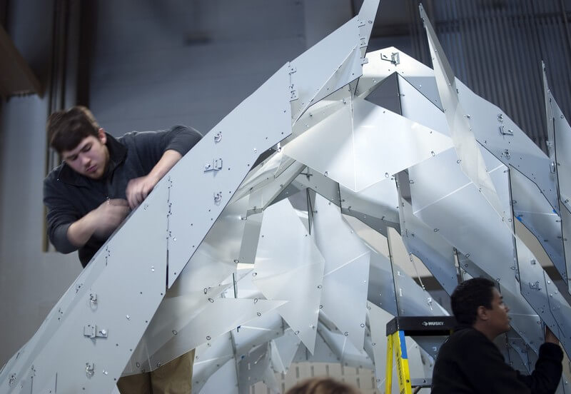 The students were also asked to consider the objectives of the SKIN Competition by incorporating metal as the primary material and digital fabrication as the construction method. Ultimately, a combination of projects were selected, combined and refined into the final project, Caret 6.
