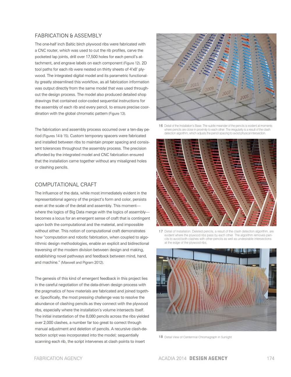 This paper by Adam Marcus describes the design, fabrication, and assembly process of Centennial Chromagraph: a large-scale installation recently constructed for the centennial anniversary of the University of Minnesota School of Architecture. The project is an exercise in data spatialization; using computational design tools to generate formal and spatial constructions with large quantities of information.