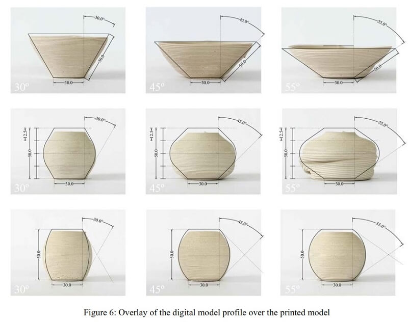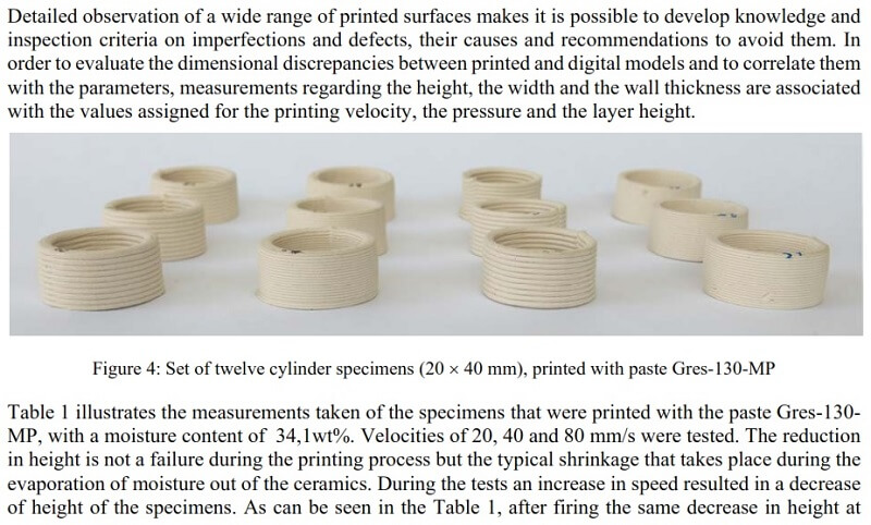 The path, material flow and printing speed of the printing process are defined digitally. The movement speed, extrusion flow and the air pressure can be controlled manually to adapt the specific printing process to the characteristics of the clay during the printing process itself. The widely accepted Pfefferkorn method has been extensively used to evaluate and control the plasticity of the stoneware used.