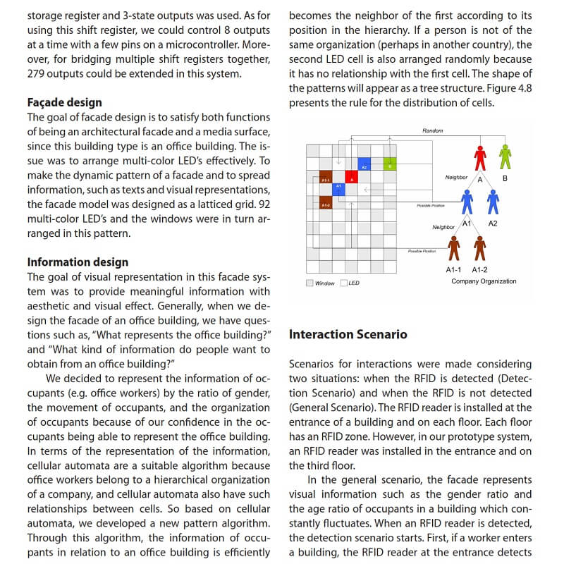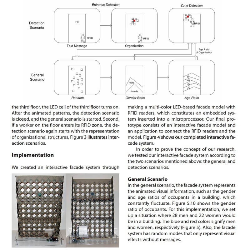 This façade system is a domain-specific, embedded system composed of three parts: an input device that employs RFID, a physical facade model that includes an output device and a microcontroller, and an application that consists of a middleware for the connection between the input and the output.
