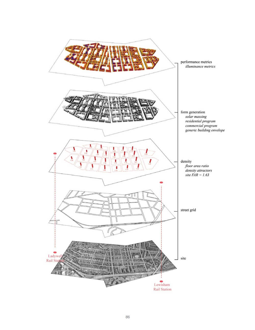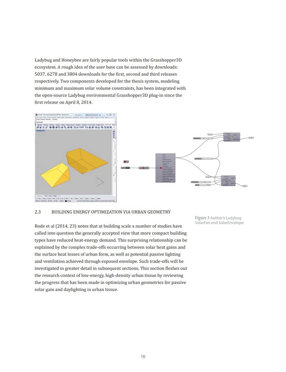 The tool consists of four parts: algorithmic city simulation to derive density targets, a generative rule set to encode building typology, a performance simulator to derive solar zoning boundaries and interior illuminance metrics, and finally an optimization method to identify the typology solutions that best match the current thesis goal. Daylighting metrics and material simulation is achieved with the RADIANCE/DAYSIM modeler. Existing urban modeling algorithms will be translated within the shape grammar system to map the dynamics of non-uniform urban densities. Optimization is implemented through the Galapagos evolutionary computing plug-in for Grasshopper3D. The thesis design system integrates research from two domains through computational methods: urban modeling and building performance simulation. The synthesis of this existing research and work thus puts forward a model of integrated city design via generative design systems. The contribution of the synthesis lies in the development of the urban energy-centric form generator, which extends procedural type generation of cities to simulated environmental and material data. The proof-of-concept is licensed under the open-source GNU General Public License, and packaged as a Python-based plug-in for Grasshopper3D, the visual scripting interface for the Rhinoceros3D CAD modeler.