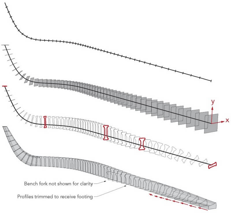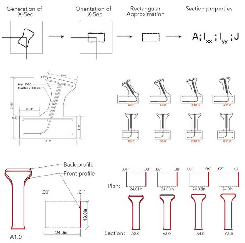 Using this system, the design geometry is generated and then deconstructed into a Finite Element model. The workflow executes a static analysis then calculates rebar size and placement, and finally generates fabrication drawings. This methodology allows architectural intent and engineering analysis to be collapsed into a single non-linear design process.