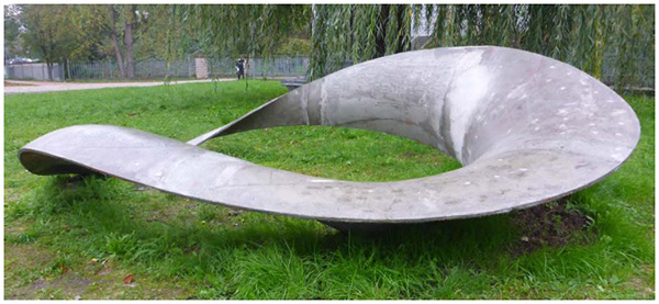 The Möbius strip was discovered by the mathematician August Ferdinand Möbius in 1858 and describes a surface with only one edge. Taking a strip of paper, twisting one end 180° and sticking the ends together gives a Möbius strip. Even cutting the entire strip at the half doesn´t lead to two strips – it remains one. Möbius strips don’t have in- and outsides. If one starts to paint one apparent side, the whole strip will be colored at the end.