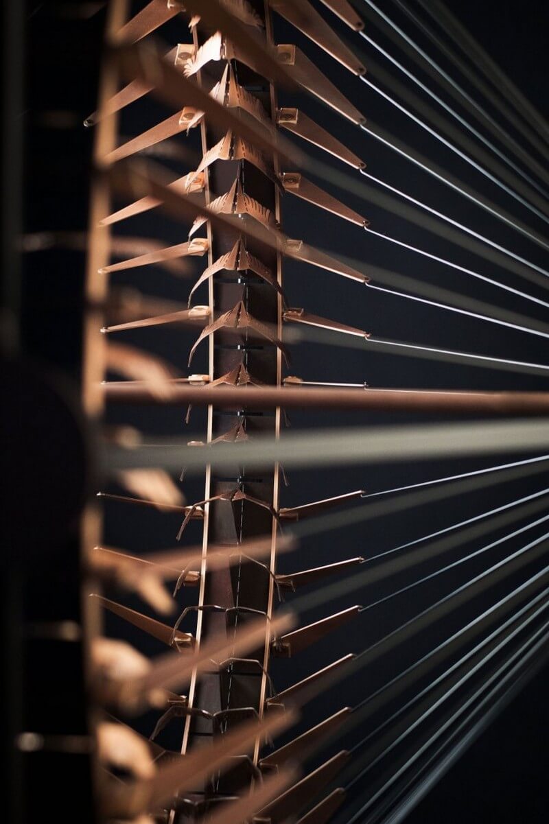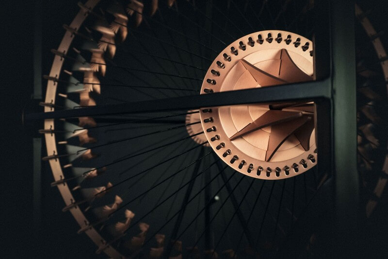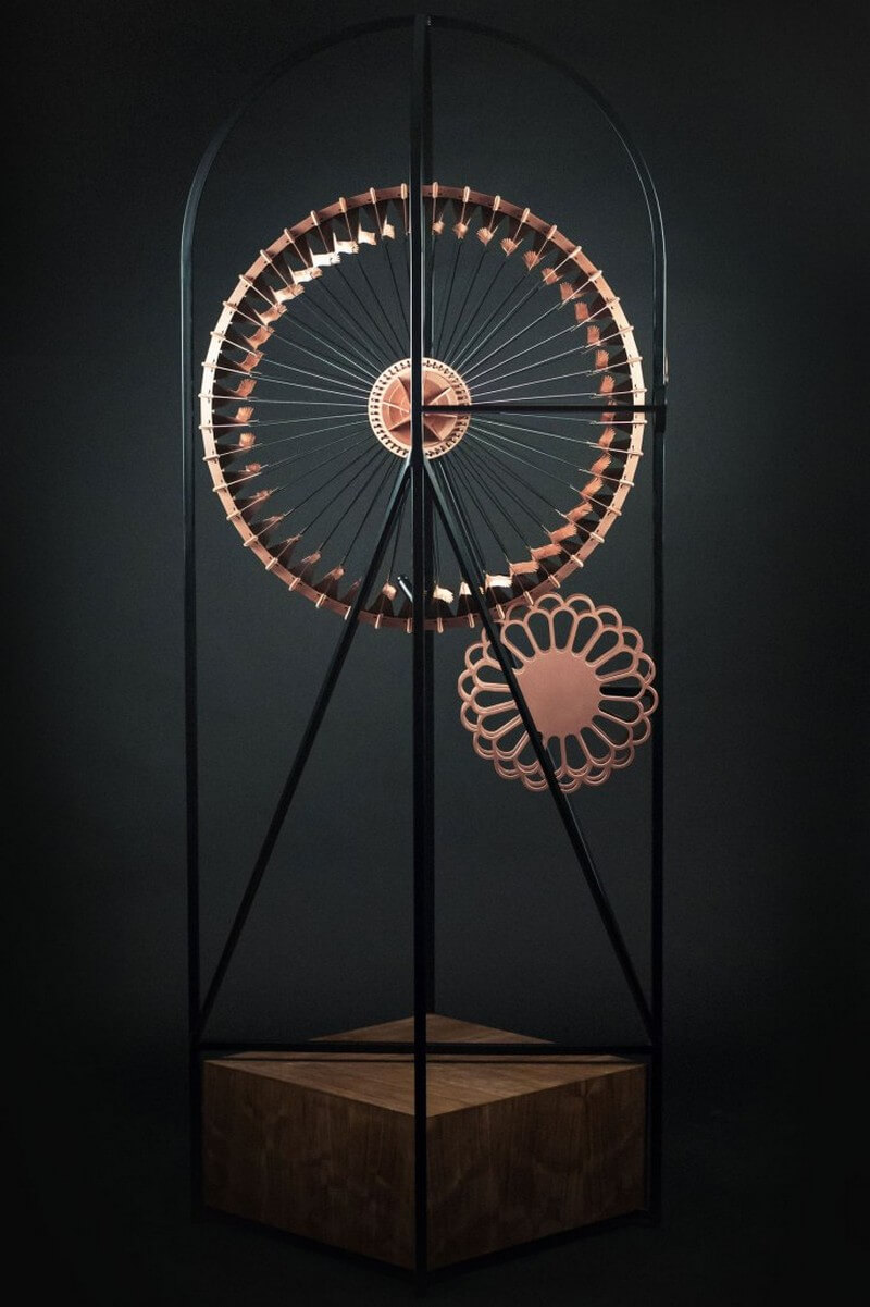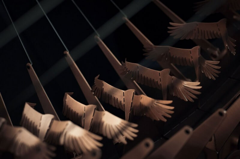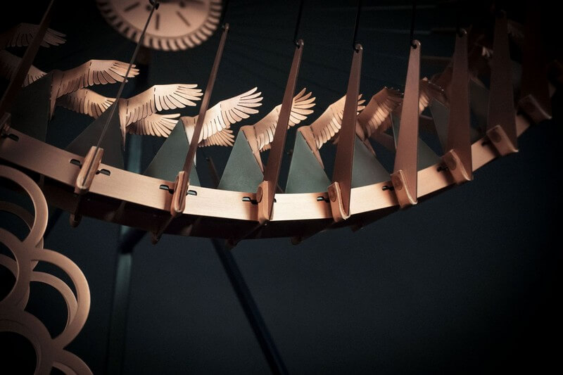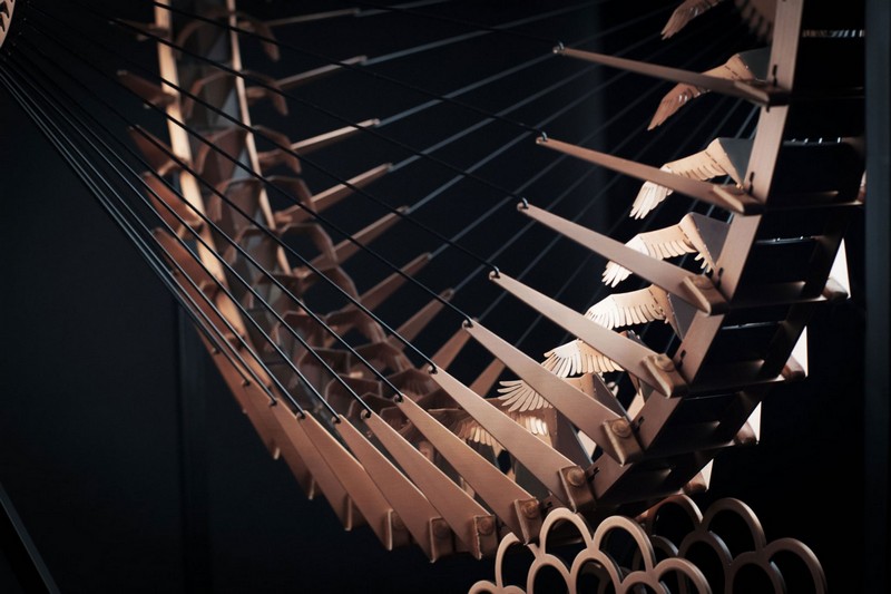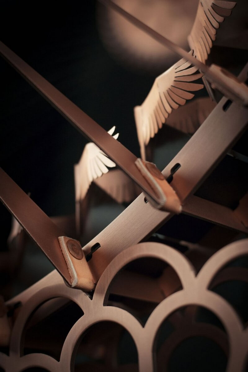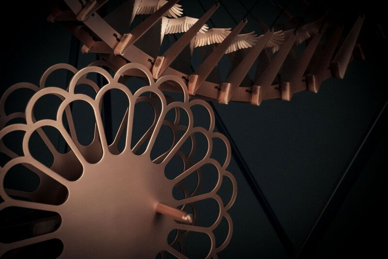 Forty-four pairs of laser-cut copper wings are arranged inside a large wheel which is cranked by hand. Looking inside while turning the hand crank will give life to the otherwise motionless display. The usually cold and inert materials suddenly become light and alive.