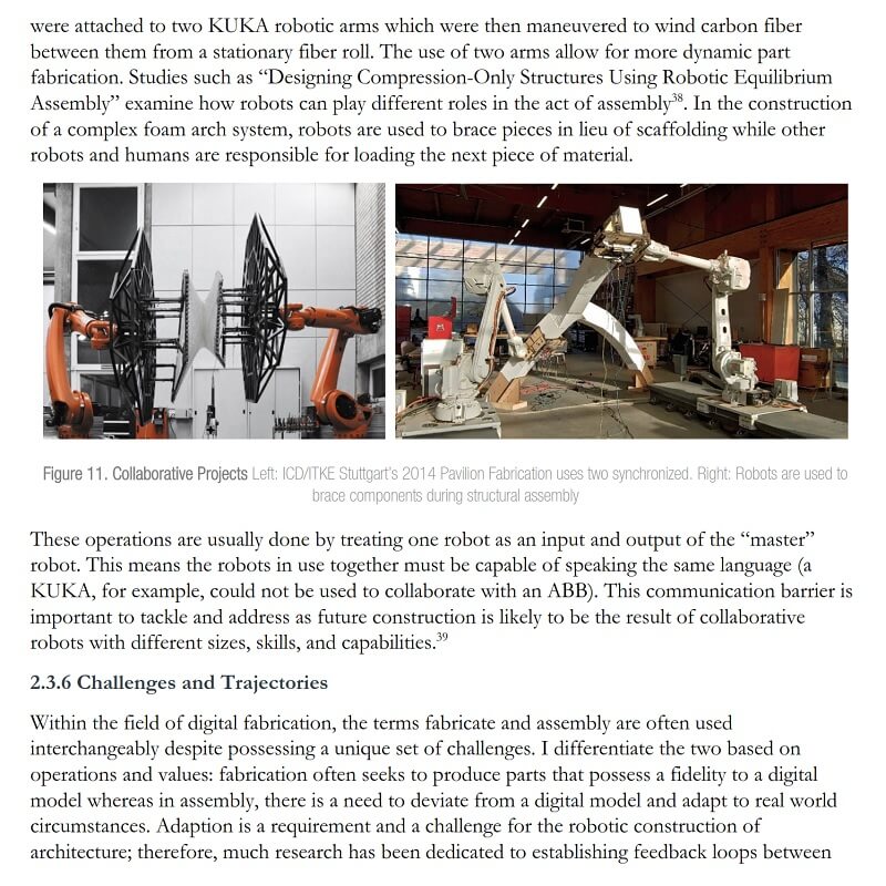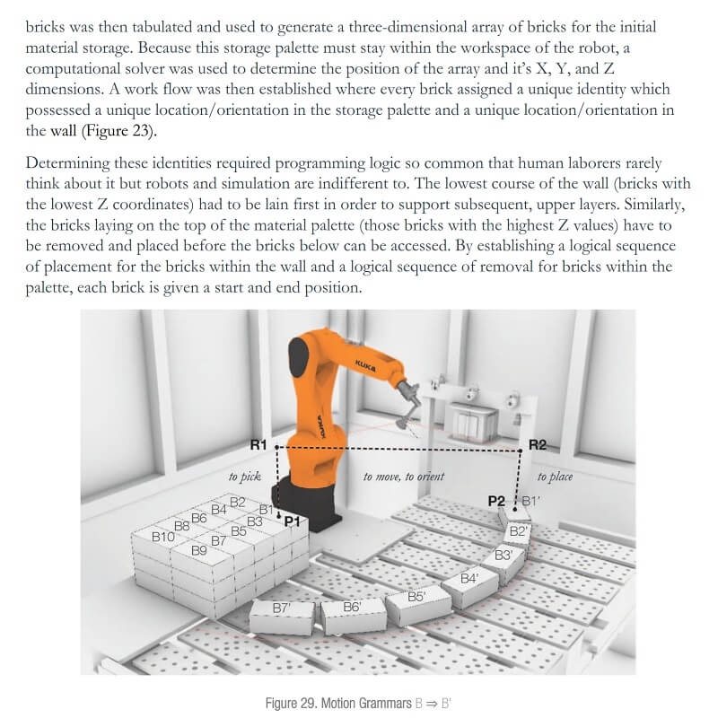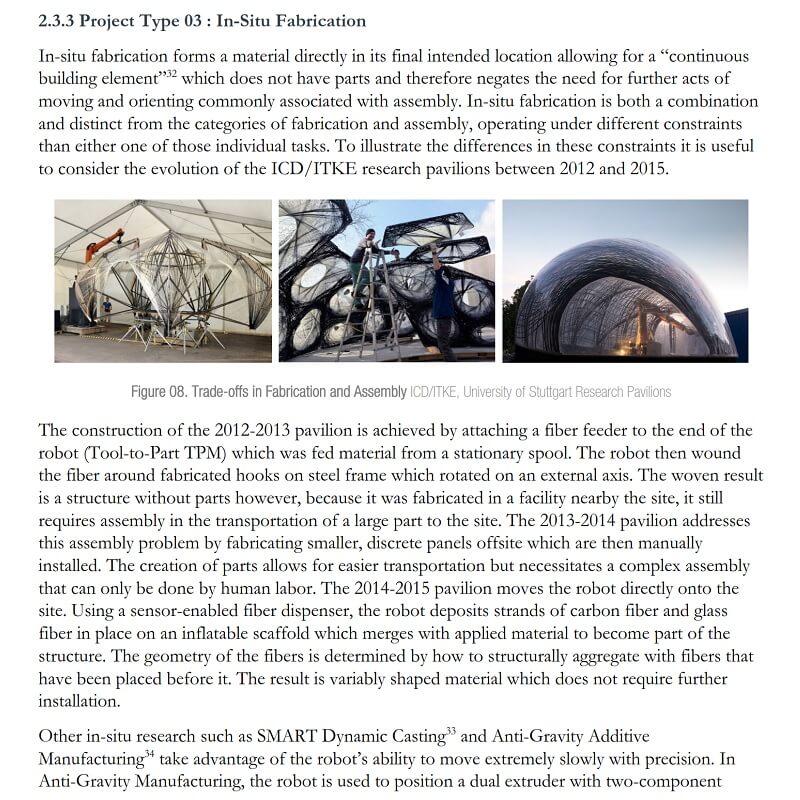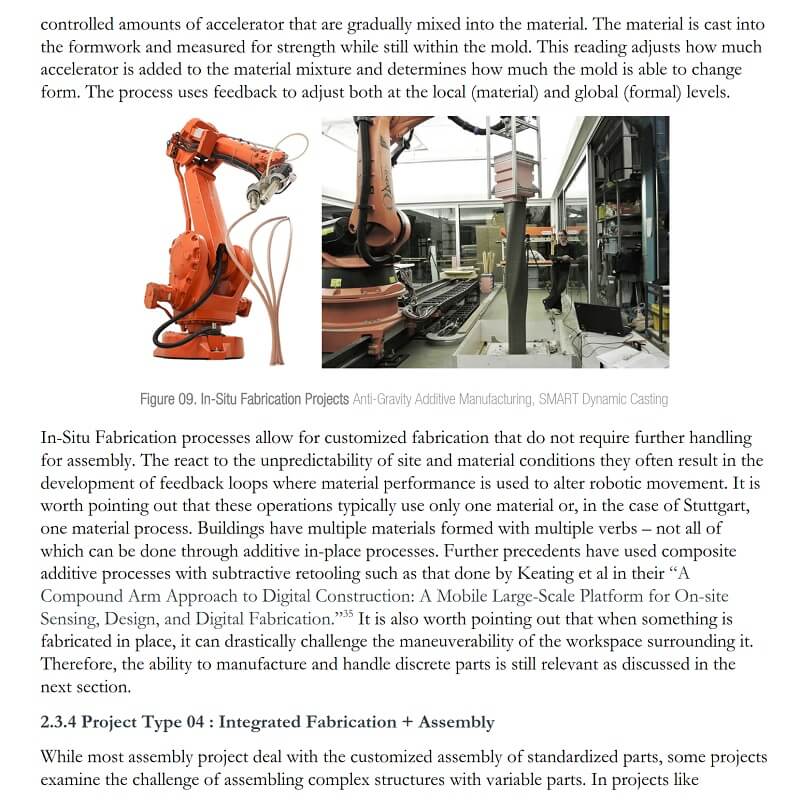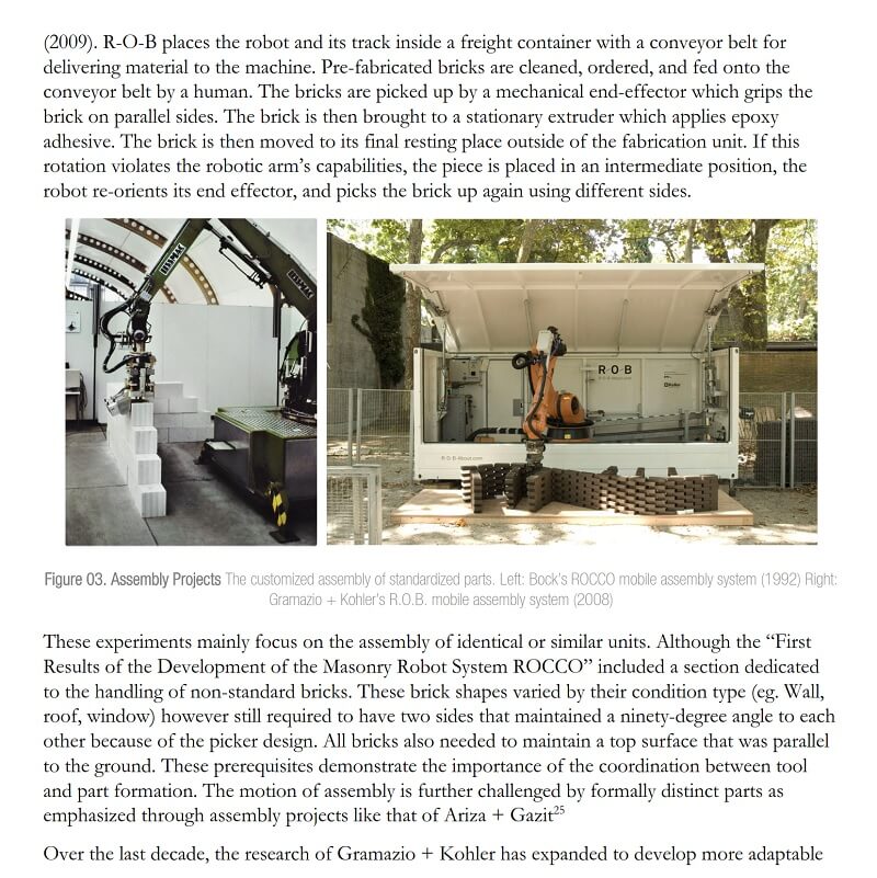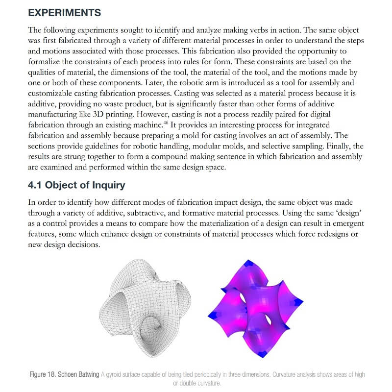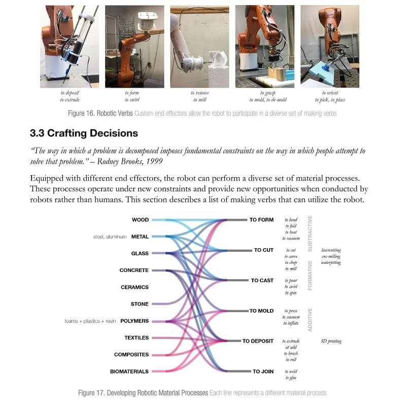 In this thesis by Molly Mason, author proposes the integration of robotic fabrication and assembly constraints into the design process to use as drivers for form-finding. The framework for this is created through codifying material processes and assembly logics into making verbs which act as descriptions of tools, material, and movement.