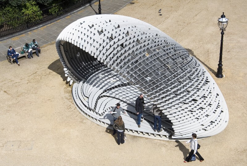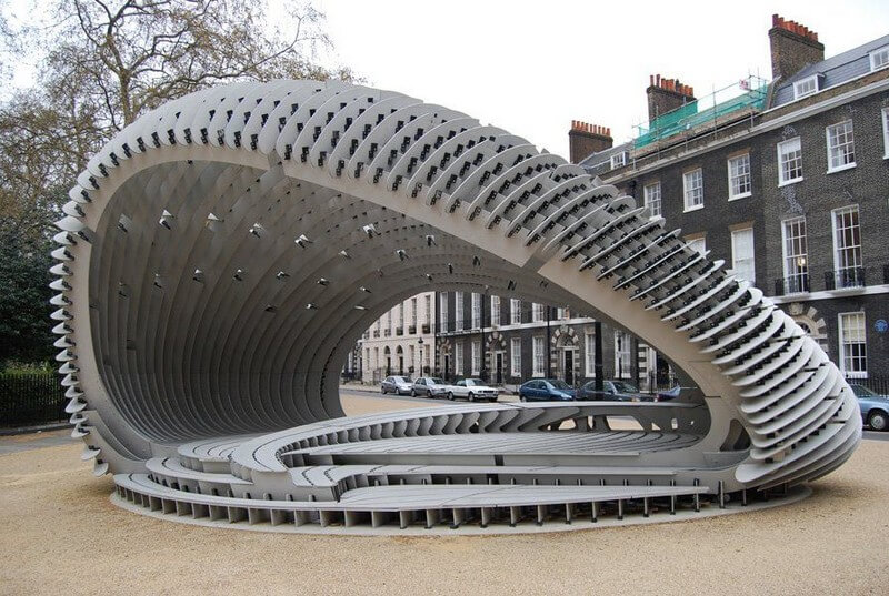 Designed by Synthesis Design + Architecture in collaboration with Alan Dempsey, [C]Space is the winning entry in the AADRL10 Pavilion Competition. It is an advanced technology concrete structure that was erected in Bedford Square London in March 2008 to commemorate the 10 year anniversary of the Design Research Laboratory Graduate Design Program at the Architectural Association.