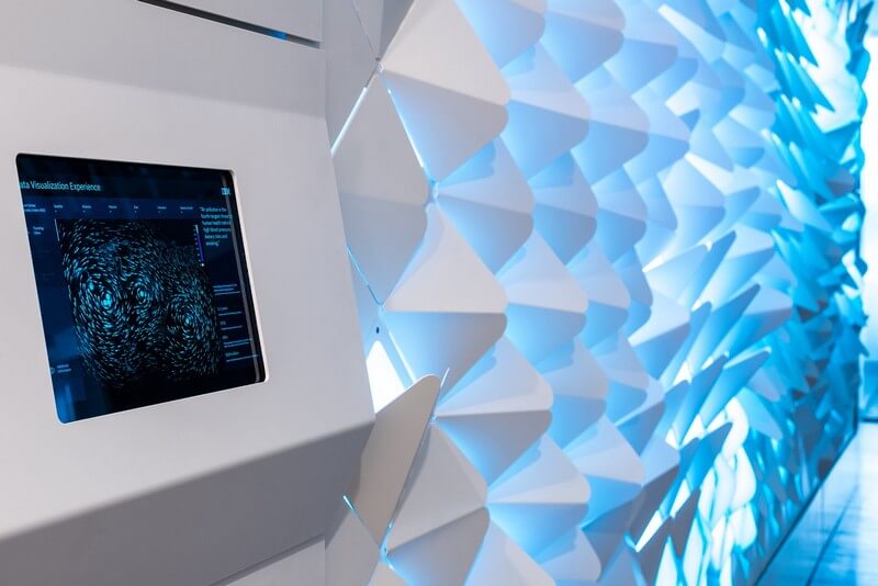SOFTlab recently completed Currents, an interactive wall installation for the IBM Watson headquarters in Atlanta. Using the Weather Channel’s air quality API, the interactive wall visualizes global air quality in real-time, allowing visitors to view representations of air quality in cities around the world.
