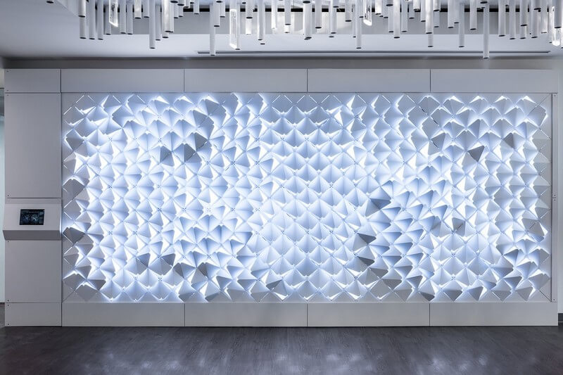 The physical form of the tiled wall is inspired by weather patterns: each aluminum tile is folded and rotated to represent the directionality of air flow vectors. These folded panels, or ‘vectors,’ are used to modulate the light of the LED grid behind it in order to create varying visualizations that represent the different cities.