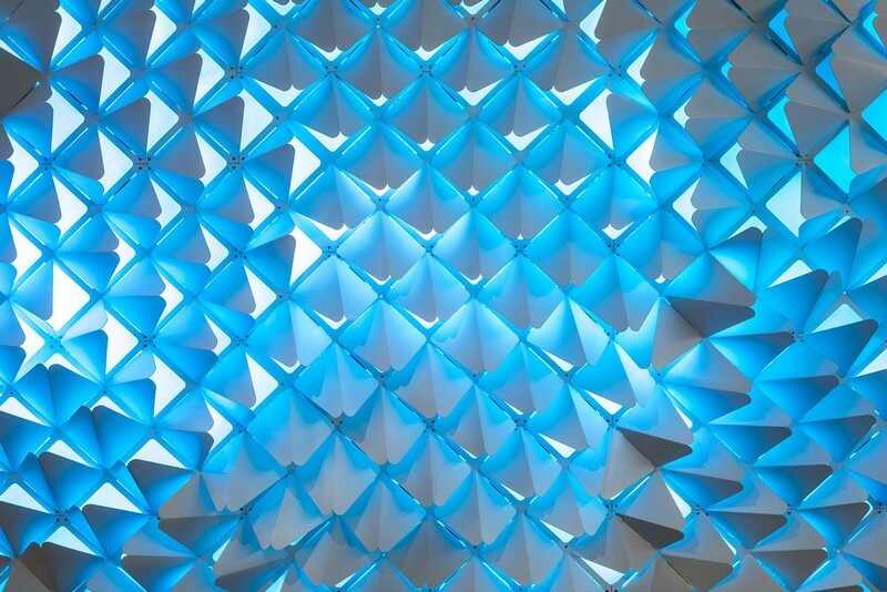 Each folded panel is back-lit by a specific color generated by the average Air Quality Index, with colors assigned on a gradient from low to high AQI. Each LED in the grid is covered by a diffuser and a white powder-coated aluminum panel that both reflects and catches light. The folding of each panel is designed to give the diffused light a three-dimensional quality as it shields and bounces light off its neighbors.