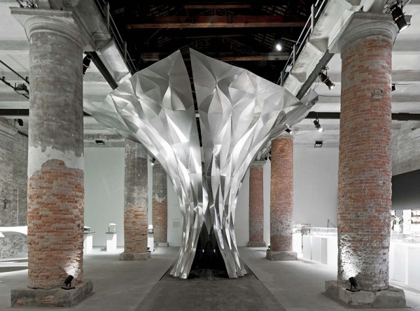 The research stems from the design and fabrication of a self-supporting, multi-panel installation for the Venice Biennale 2012 and operates against the backdrop of the exciting potentials that the field of curved-crease folding offers in the development of curved surfaces that can be manufactured from sheet material.