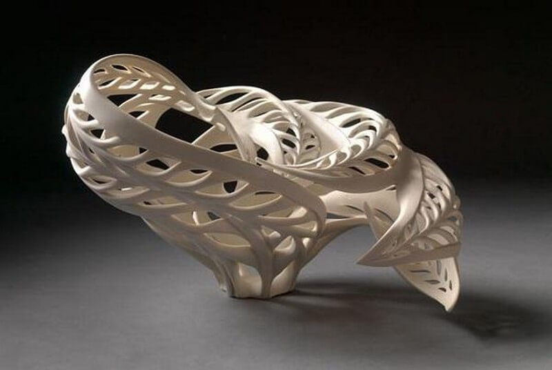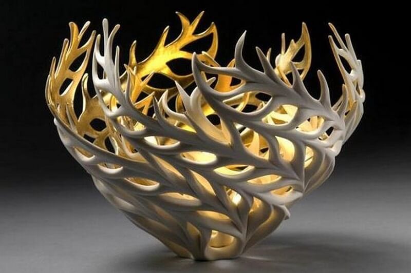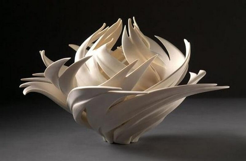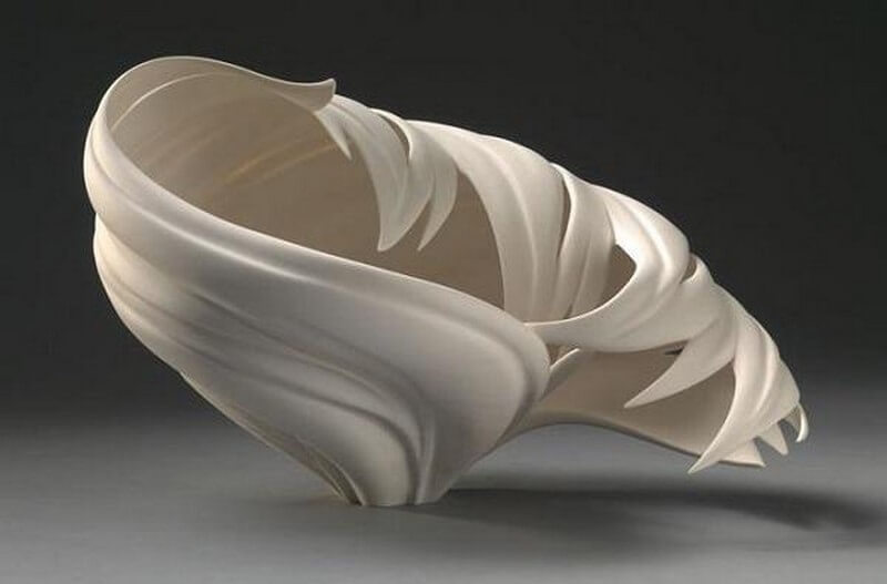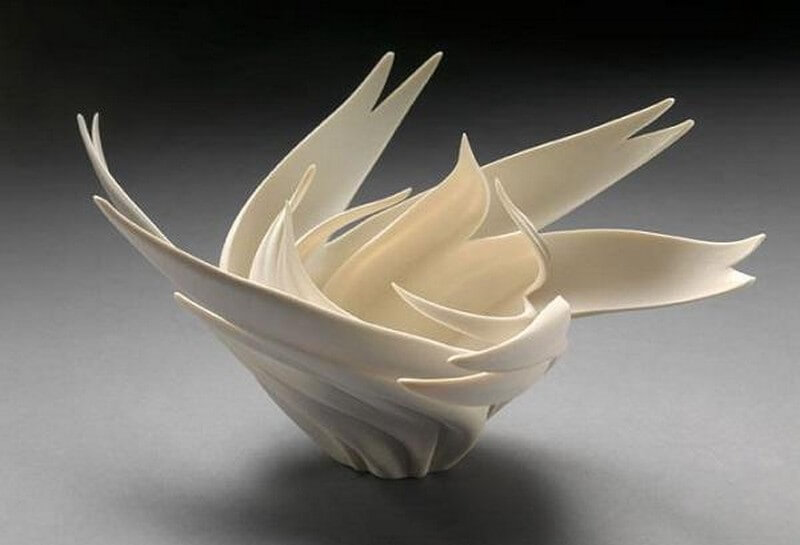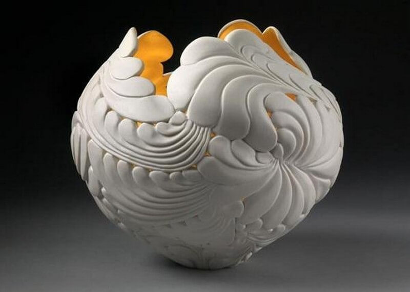 Jennifer McCurdy has been working with porcelain for over twenty five years. The artist has been really putting it to the test structurally, creating fantastic designs. She has been experimenting with how thin high fire porcelain can be before it collapses in the kiln and how much it can be cut away and still maintain structural integrity.