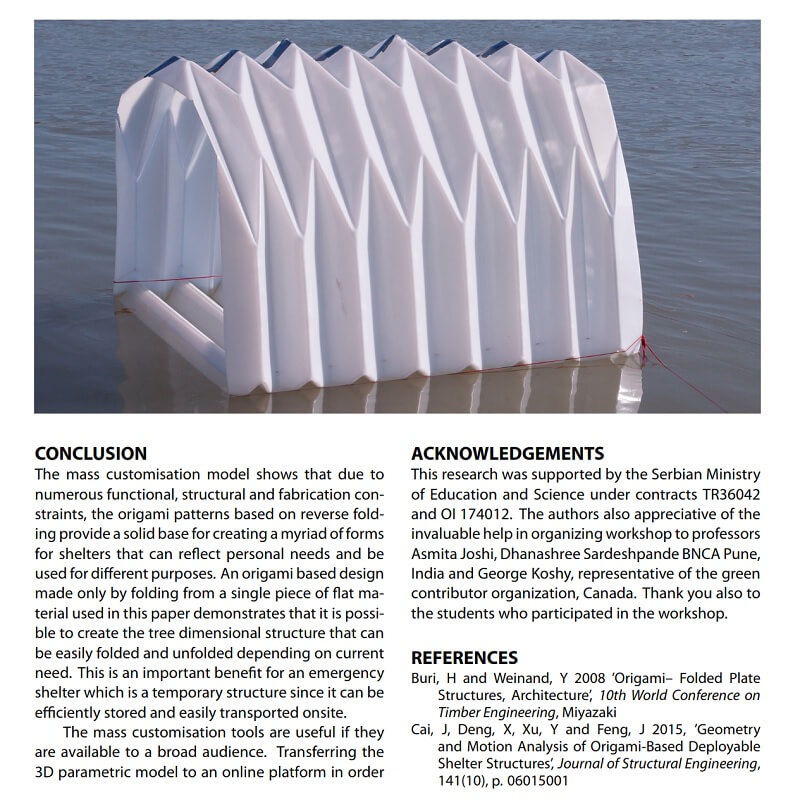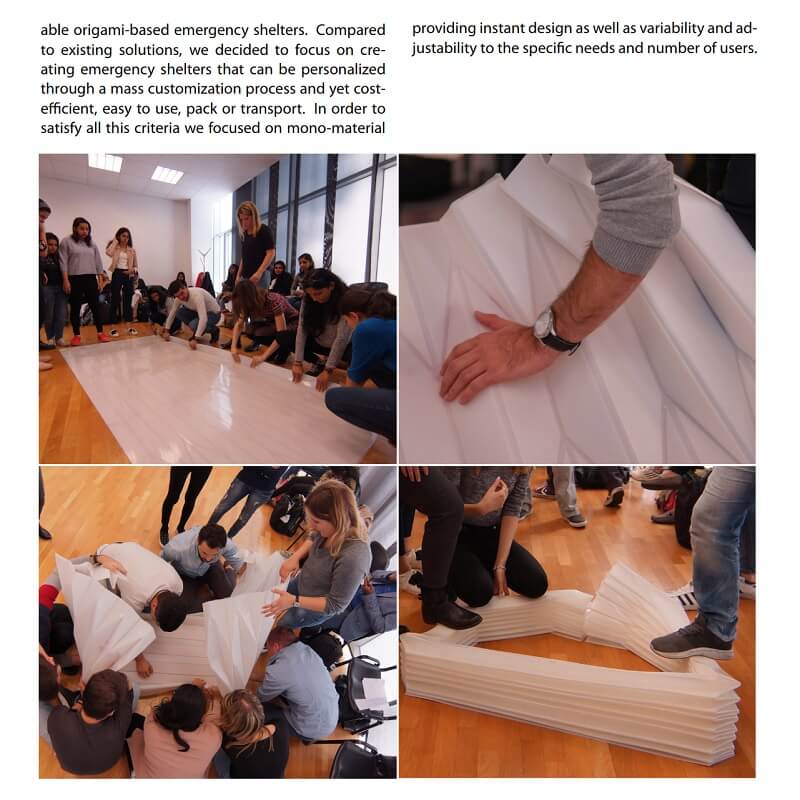 The main motivation for such research has risen from a global need to provide emergency shelters for people affected by natural disaster. The model is designed to be a flat packable, mono-material based on a double corrugated folding pattern.