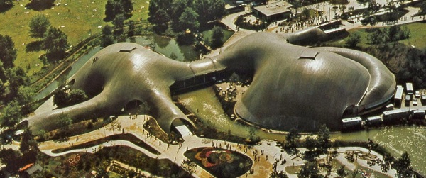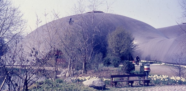 Two small auditoria were required within the Montreal Expo 67 tent and these were made using grid shell construction. The meshes were prefabricated in Germany and sent to Canada folded into bundles, where they were opened up and installed on site. The grids were clad with thin plywood sheets to form the enclosures.