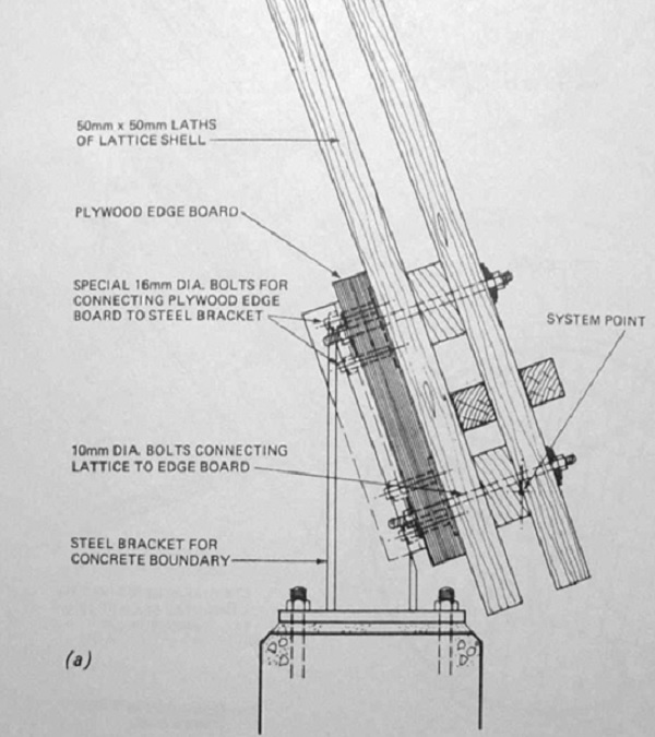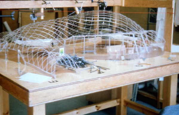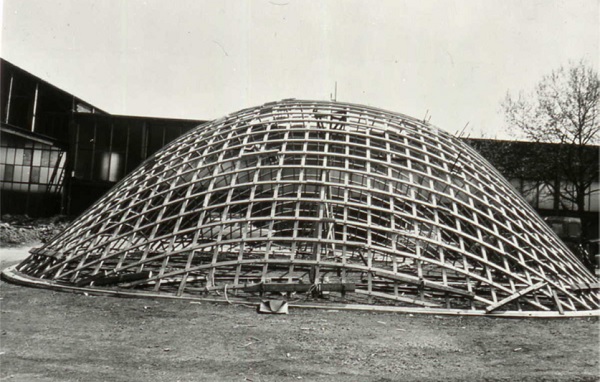 In 1962 he built, with some students at Berkeley, a trial structure of a dome standing on four points using steel rods. Later that same year he made a trial timber structure at Essen on a15 m × 15 m super-elliptical plan.