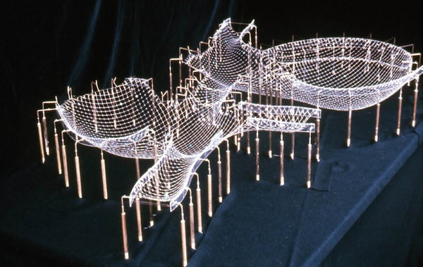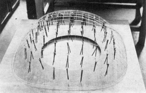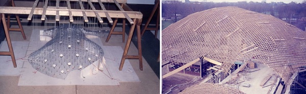 As well as tensile structures, in the late 1950s Otto became interested in light-weight shells which could be formed using the Hookean principle of inverting a hanging net (According to Lisa Jardine, Robert Hooke used this method to show Christopher Wren how the Dome of St Paul’s might work).