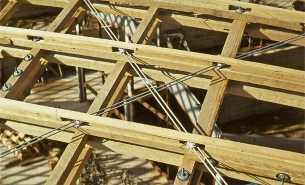This technique was used to construct a 9000 m2 curved roof structure from 5 cm square timber laths. This paper summarises the design and engineering work that went into the construction of this remarkable building.
