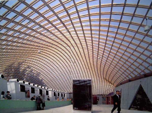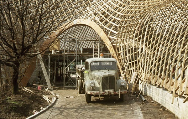 The innovative architect, Frei Otto, developed the concept of gridshells which could be designed by a funicular modelling method and constructed from an equal mesh net of timber laths bent into the planned shape. In 1970