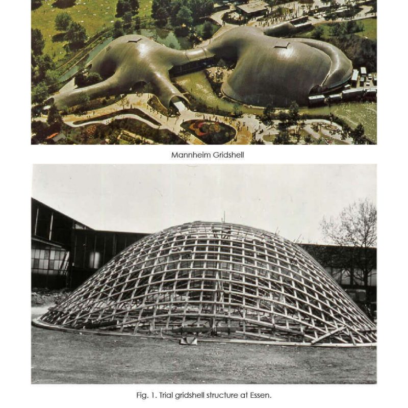 The innovative architect, Frei Otto, developed the concept of gridshells which could be designed by a funicular modelling method and constructed from an equal mesh net of timber laths bent into the planned shape. In 1970