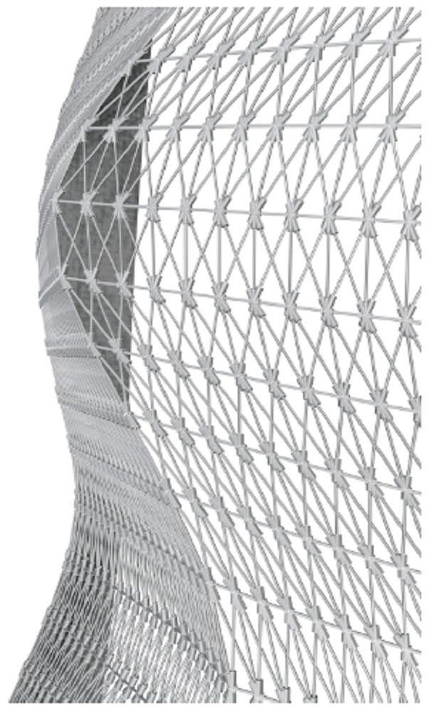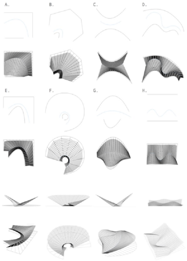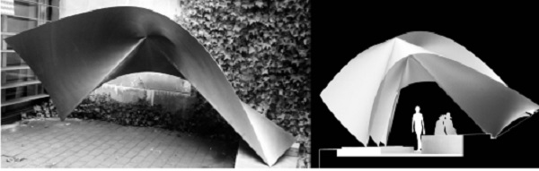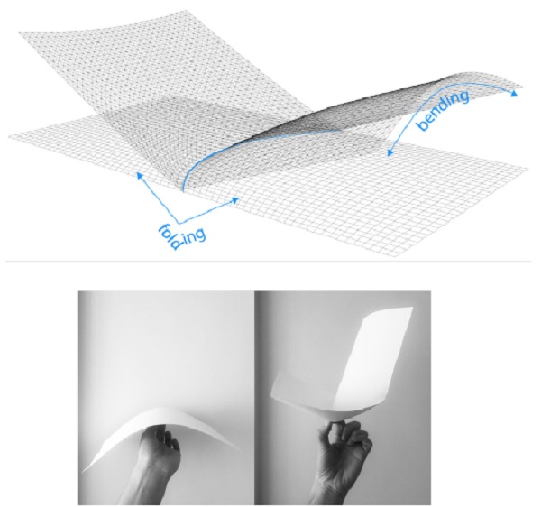 The interesting point of curved folding is the complex three-dimensional form that is generated by this hybrid surface deformation. In this form, the slender sheet gains strength and become more resistant to buckling.