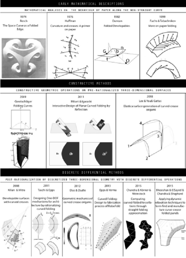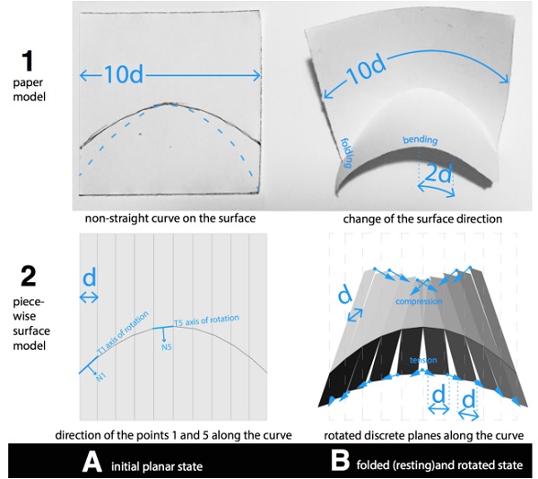 In the problem of curved folding, the challenge is to understand and measure the resultant three-dimensional configuration of the curved folded sheet when it is manually modeled. The resultant three-dimensional form is “a resting state of the deformed two-dimensional sheet which goes beyond the mathematics of developable surfaces to a question of physics: equilibria of an unstrechable surface with uncreased and creased portions folding elastically toward desired angles”.