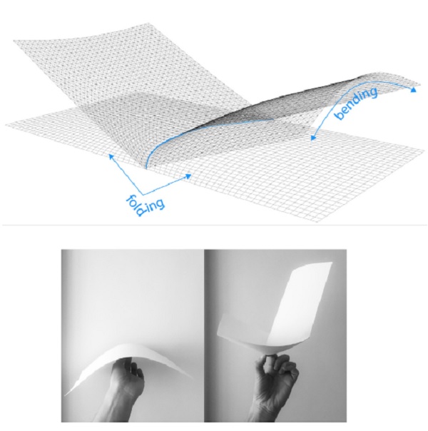 While the pure folding transfigures the sheet to a polyhedral surface with an abrupt change in the surface direction, the act of bending forms the sheet to a smoothly curved surface with a gradual slight change in the surface direction.