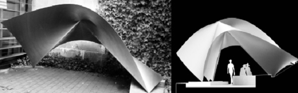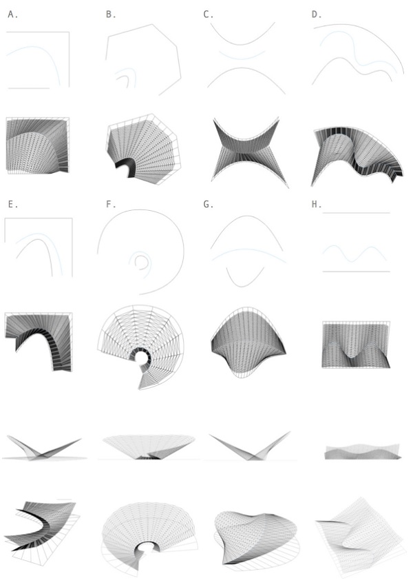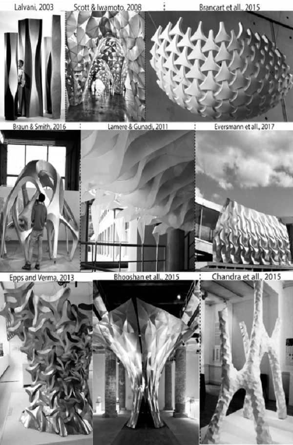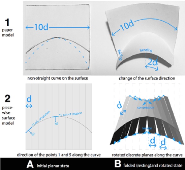 The interesting point of curved folding is the complex three-dimensional form that is generated by this hybrid surface deformation. In this form, the slender sheet gains strength and become more resistant to buckling.