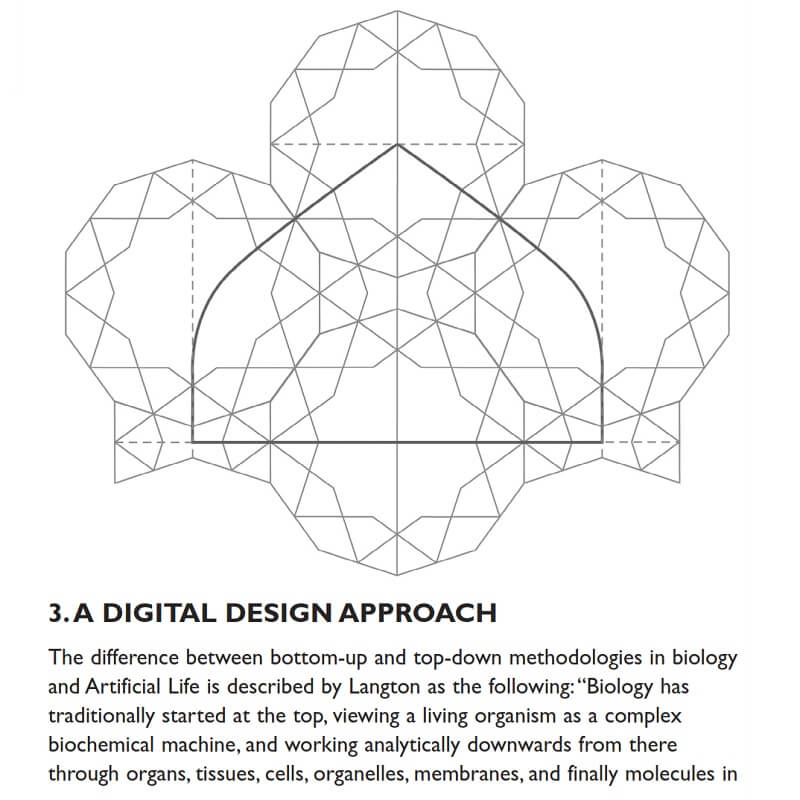 This paper by Gernot Riether and Daniel Baerlecken, will provide a different thinking of the relationship of massing and texture in Islamic Architecture from a digital point of view. An analysis of Islamic patterns challenged this relationship in Islamic architecture. Digital design and fabrication methods for a series of studies and an installation were used to respond to the findings of the analysis.