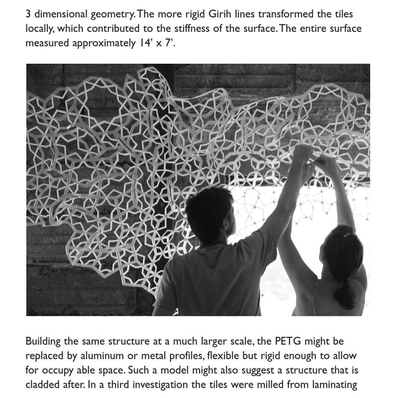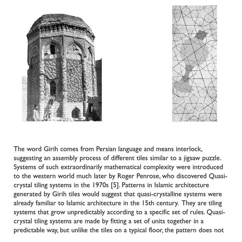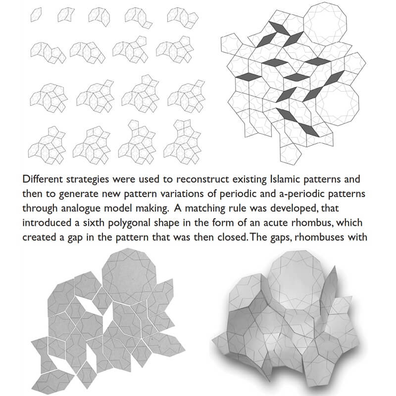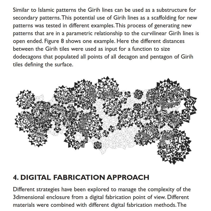 This paper by Gernot Riether and Daniel Baerlecken, will provide a different thinking of the relationship of massing and texture in Islamic Architecture from a digital point of view. An analysis of Islamic patterns challenged this relationship in Islamic architecture. Digital design and fabrication methods for a series of studies and an installation were used to respond to the findings of the analysis.