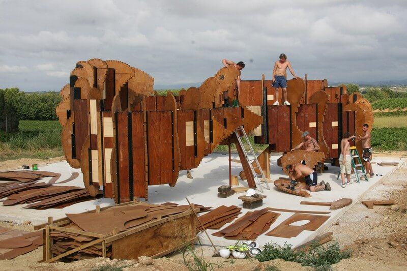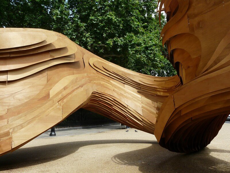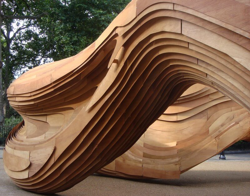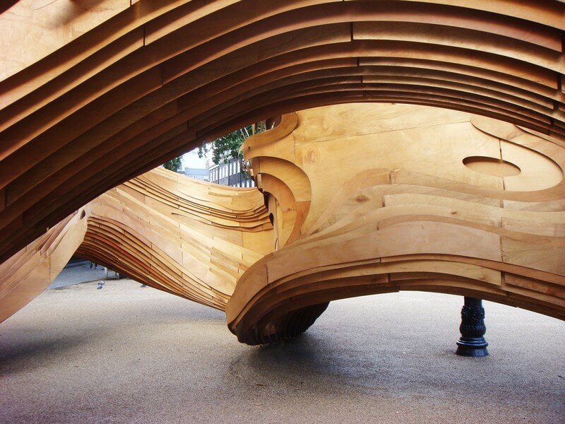 The 28 layers of plywood flow in a self-assuming organic shape, appearing as an evolved object. This aesthetic recalls the designs of AA alumni Zaha Hadid and Rem Koolhaas.