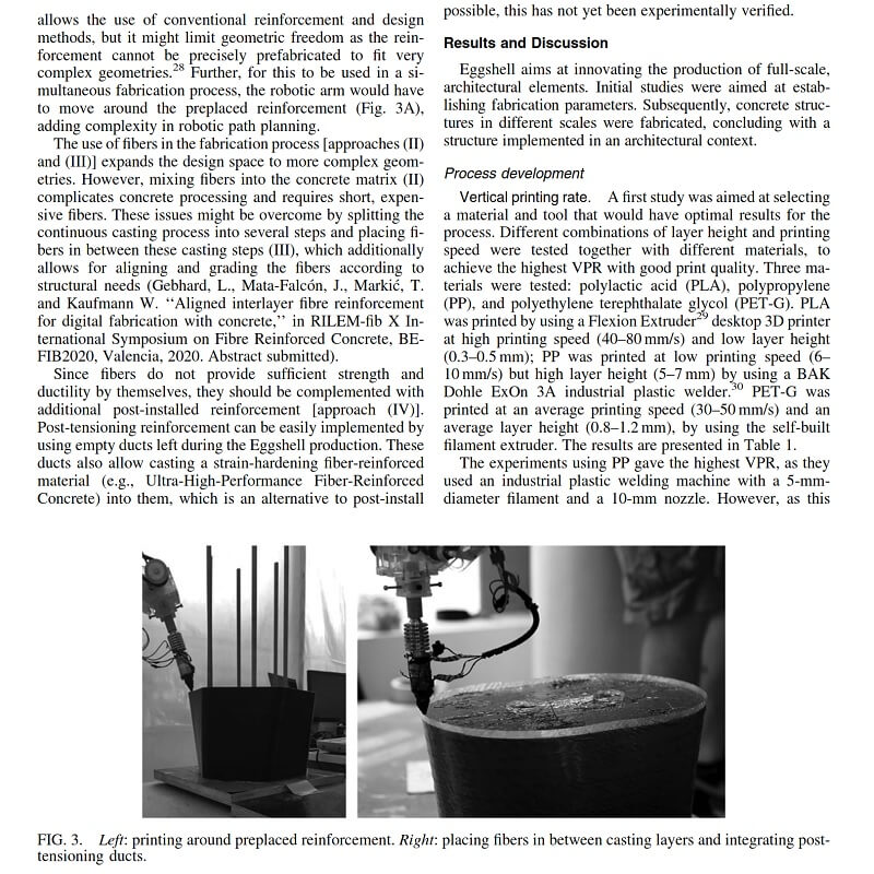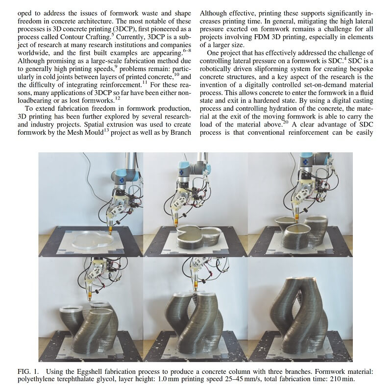 Jaime Mata-Falcon, Fabio Gramazio, Matthias Kohler, and Robert J. Flatt, presents one possible application, a novel fabrication process that combines large-scale robotic fused deposition modeling 3D printing with simultaneous casting of a fast-hardening, set-on-demand concrete.