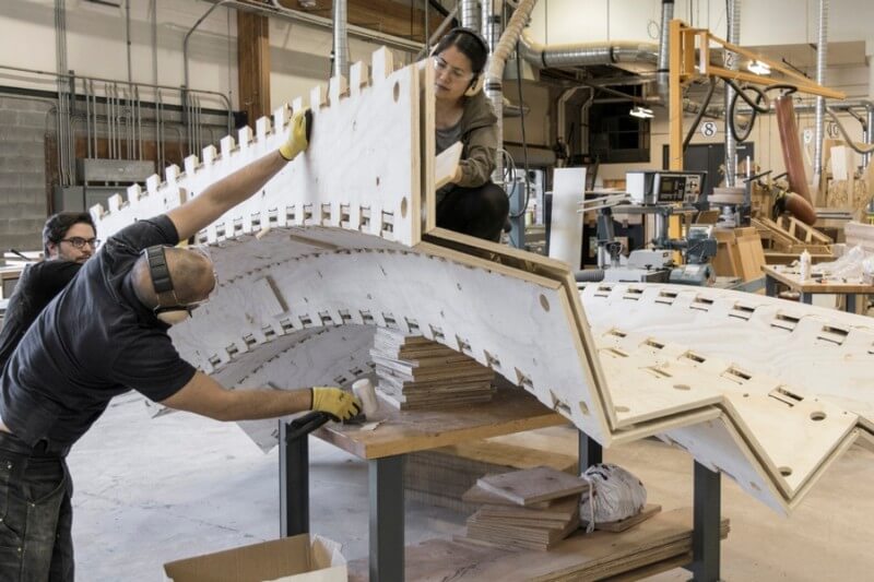 Using an eight-axis industrial robot configuration, the participants were guided through the unique technical and conceptual foundations that underpin robotic milling in wood through the development and construction of a full-scale assembly.