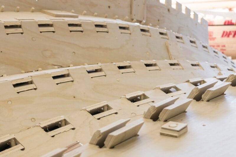 Advanced timber fabrication techniques, state of the art computational tools, and material-oriented design strategies are incorporated in the workshop to take advantage of the extended fabrication range of the multi-axis set up to create a unique large-scale material assembly system.