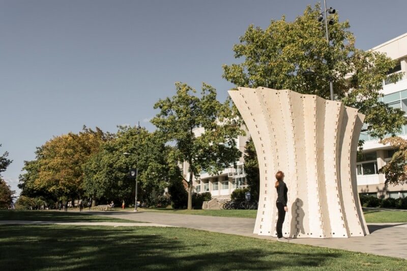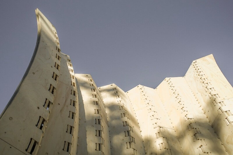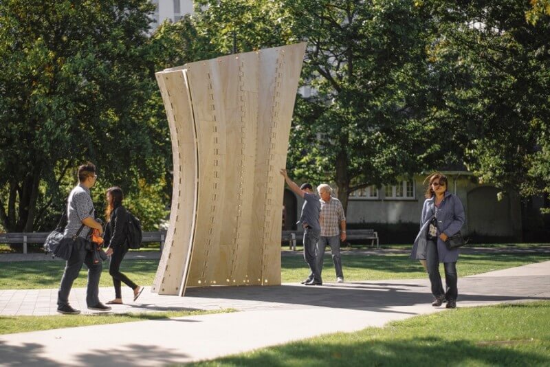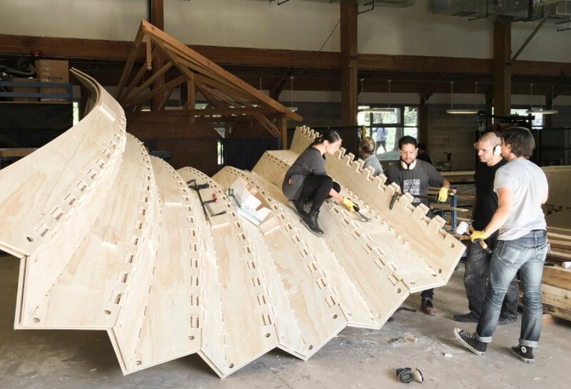 Taking place at the Centre for Advanced Wood Processing, University of British Columbia, and led by research associates David Correa and Oliver David Krieg of the Institute for Computational Design (ICD); the workshop explored elastic bending of large scale timber sheets for double-layered timber structures through a combined approach of material oriented design and robotic fabrication techniques.