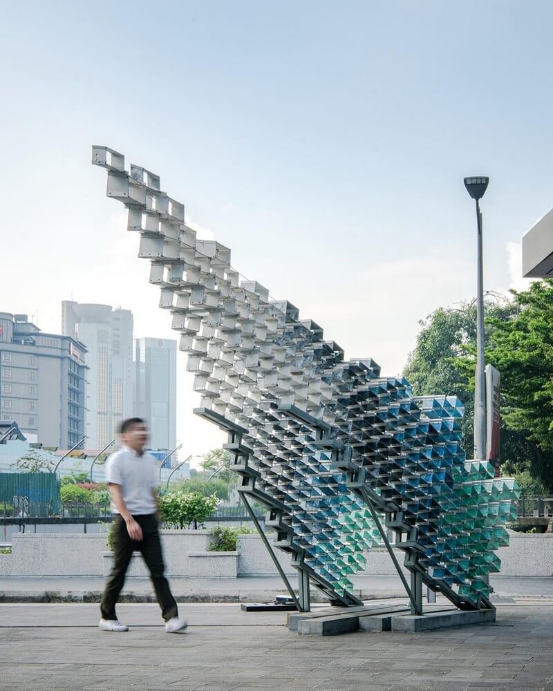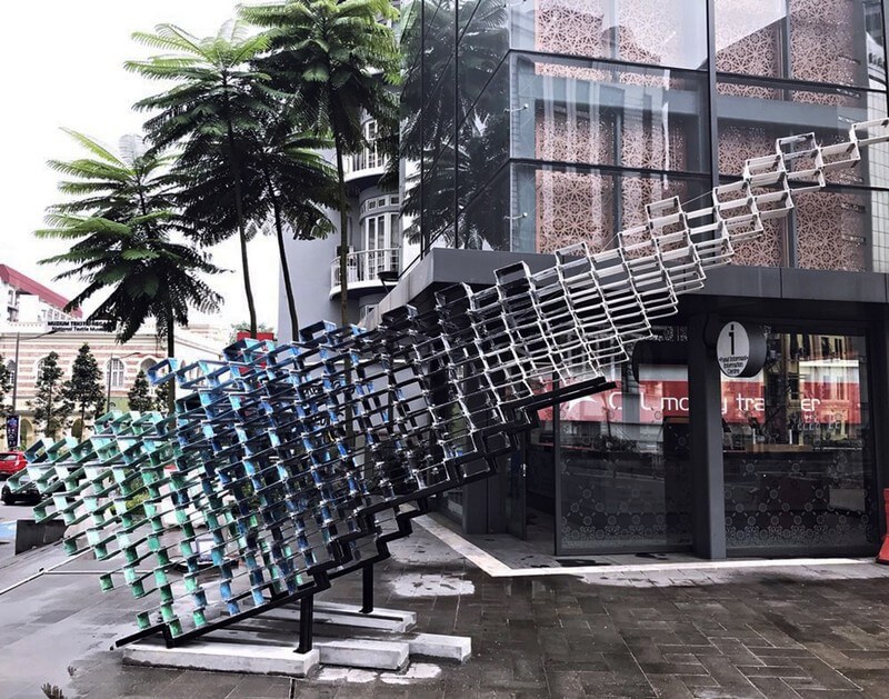 Entwine, Teo’s site-specific art installation made entirely out of recycled plastic tiles, is located at the Kuala Lumpur’s Masjid Jamek Lookout Point. It serves as an open letter to both the authorities and to the public, addressing the city’s waste management predicament.
