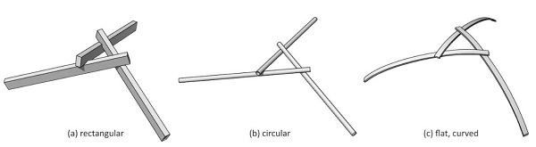 Thus, the potential of bending-active reciprocal structures lies in the beneficial manipulation of bending forces to further simplify fabrication and detailing. Figure 1 shows a reciprocal configuration of three bending-active elements with flat cross-section next to the commonly used rectangular and circular ones.