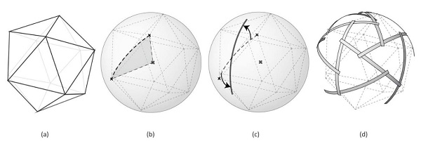 Figure 2: Based on a polyhedral shape, in this case an icosahedron (a), we can model a spherical reciprocal structure by projecting the edges on the circumscribed sphere (b), rotating them (c) and finding the four intersection points (d).