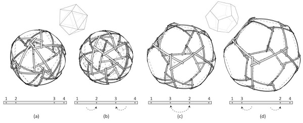 Figure 3: By rotating the beam elements on the spherical surface, the intermediate connections slide over the beam. In the middle they flip sides, creating the reciprocal configurations of the original polyhedron’s dual (here the dodecahedron). Thus, each configuration has a dual consisting of the same components (a and d, b and c).