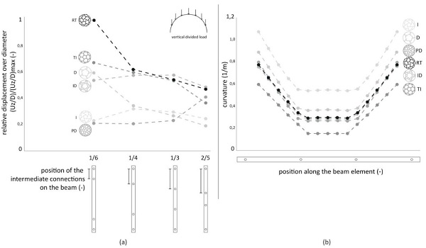 Figure 4: Although geometrically easy to reconfigure, the different dome types behave differently upon loading. (a) The selection of a beam element defines the spread of solutions for the different configurations. Moving the intermediate connections towards the ends enlarges this spread, which is unfavourable. (b) The variation in the curvature, and as a result the pre-bending, for different dome types complicates the dimensioning of the flexible beams, as the required flexibility reduces the stiffness of the assembled structure.