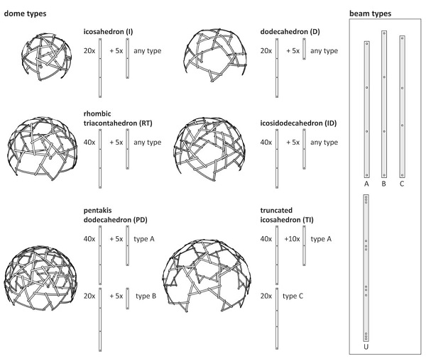 Figure 5: Six polyhedra are well-suited for the development of bending-active reciprocal domes. As we can construct all these configurations with only a limited number of different beam types, several possibilities for developing a kit of parts exist. Moreover, a universal component (beam type U) could combine all the necessary bolt holes in one single beam element.