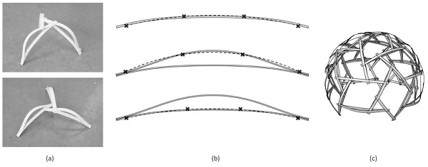 Figure 6: A double-layered component allows to pre-bend the flexible elements in the desired shape, avoiding on-site bending during the assembly. (a) Both layers allow intermediate connections, reducing the inclination when connecting to the least curved bottom one. (b) The only requirement is that the component contains the correct connection locations for the desired geometry, and allows planar connections between the end and intermediate connections. (c) One specific component curvature corresponds to the desired dome geometry, here the rhombic triacontahedron.