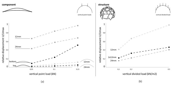 Figure 7: The curvature of the bending-active components influences their load-bearing behaviour in the reciprocal geometry. (a) The curved components have a higher resistance to the bending imposed on them by the reciprocal organisation of the elements. Although the layers are only connected at the ends, the double layering has a significant effect on the structural performance. (b) This is also the case when applying the double-layered component to a dome, as its performance is quite close to that of a single-layered component with double thickness.