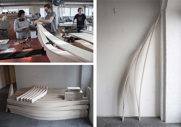 Figure 8: The double layered components consist of two plywood laths of 12mm, connected at the ends. Pushing and fixing the top layer onto a jig simplifies the fabrication process, allows manual assembly by one person (top left). The kit of parts for the structure consists of only two different pieces (right). Thanks to the discretisation of the elements in the reciprocal organisation, the elements remain fairly short and the full set of components very compact (bottom left). (pictures by Jack Cripps)