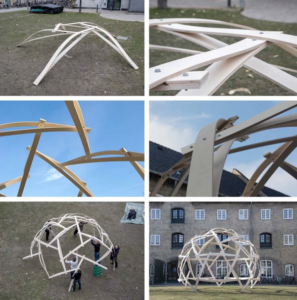 Figure 9: We constructed the ReciPlyDome from six pre-assembled pentagonal modules, optimising the assembly time on the ground (top left). Thanks to the very simple connections (top right), the assembly required only basic hand tools (bottom left). The components allowed just enough deformation to manually induce the torsion needed to align the components at the connections (centre). The fully assembled structure is lightweight but shows efficient shell behaviour (bottom right). (pictures by Jack Cripps)
