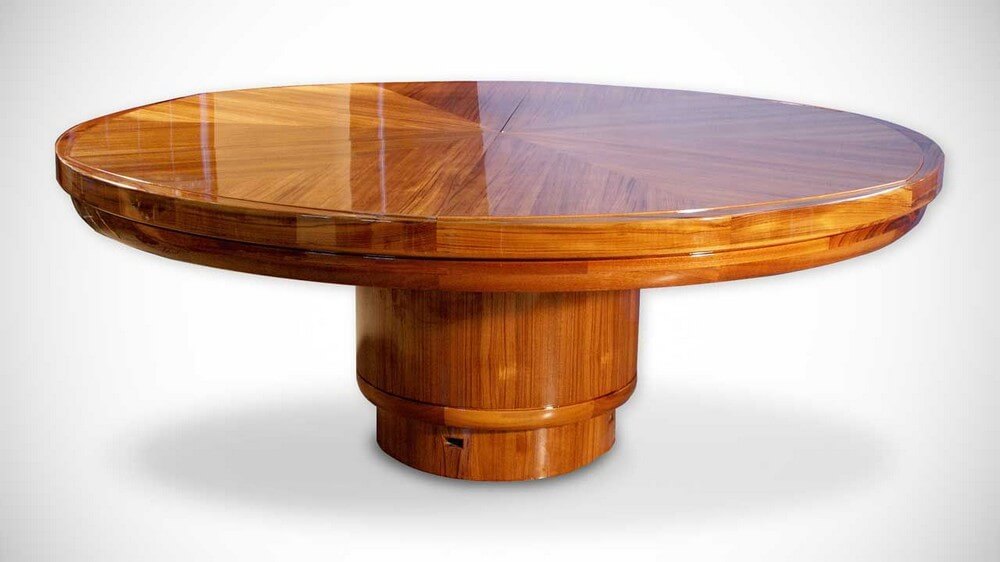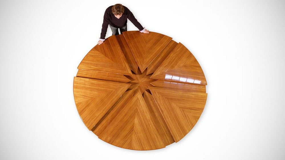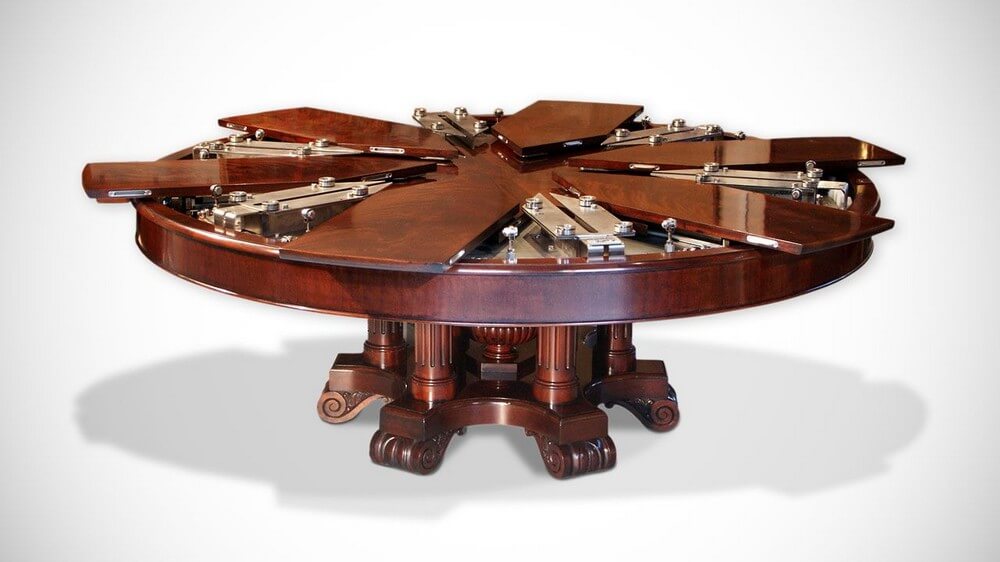 Jupe’s initial creation of the 19th century was round and featured the same ingenious geometry that can be seen in the current Fletcher Capstan table. Even though the 19th-century table would expand radially and change from small to a larger size, it could not store its own expansion Leaves.
