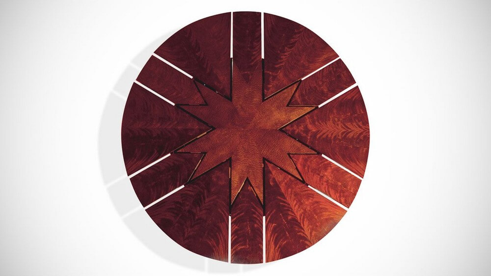 The structure of this seemingly simple table is based on the principle of layering. It consists of three layers – and the first layer (top surface) composed of 6 pie-shaped planks along with a drum table lookalike circular skirt. The second layer also has 6 planks in the shape of arrows while the third or final layer is in the form of a large star-shaped leaf.
