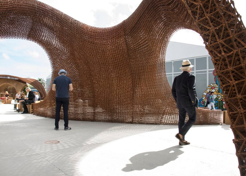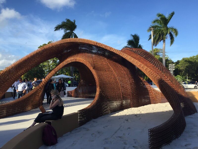 The intent was to draw inspiration from Miami’s celebrated spirit of play, the dynamic beach morphology, and the city’s emergent function as a center for creative visioning and technological discovery. Oak Ridge National Laboratory (ORNL) was also brought in as a fabricator to provide a second printing technology that celebrated a biodegradable bamboo medium.
