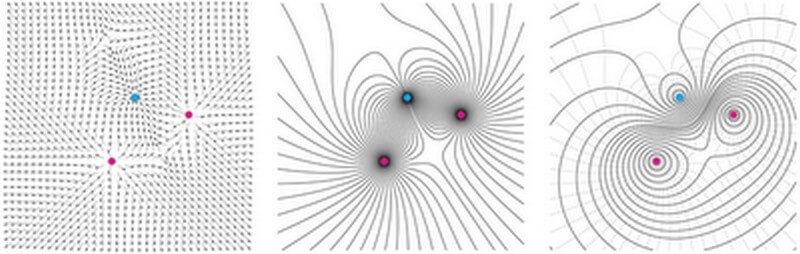 FlowL by uto is a plug-in to visualize a vector field, generated through positive and negative point charges. The path lines are calculated with the “Runge-Kutta 4th Order Method” short “RK4”, developed by the German mathematicians C. Runge and M.W. Kutta. around 1900.