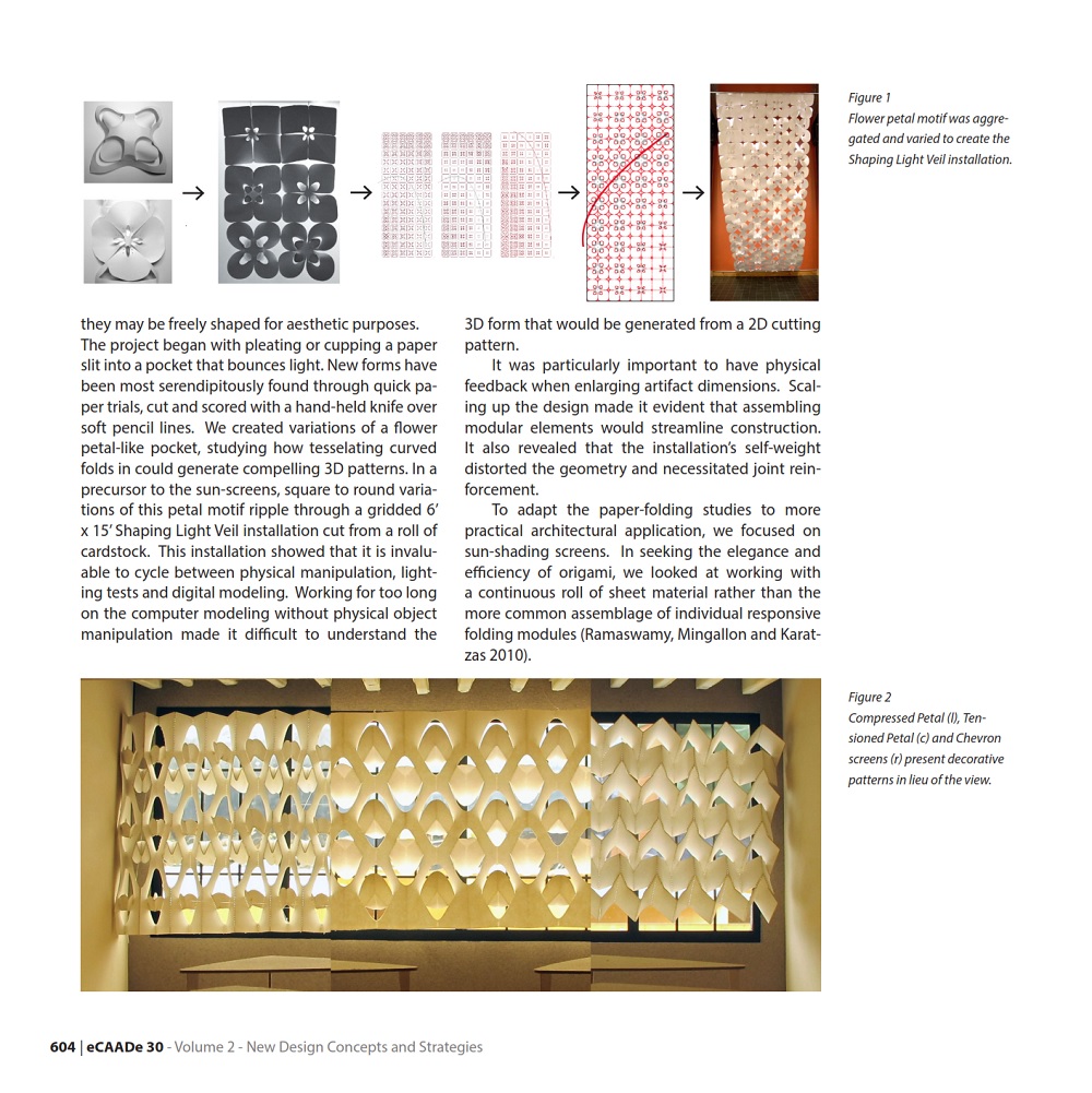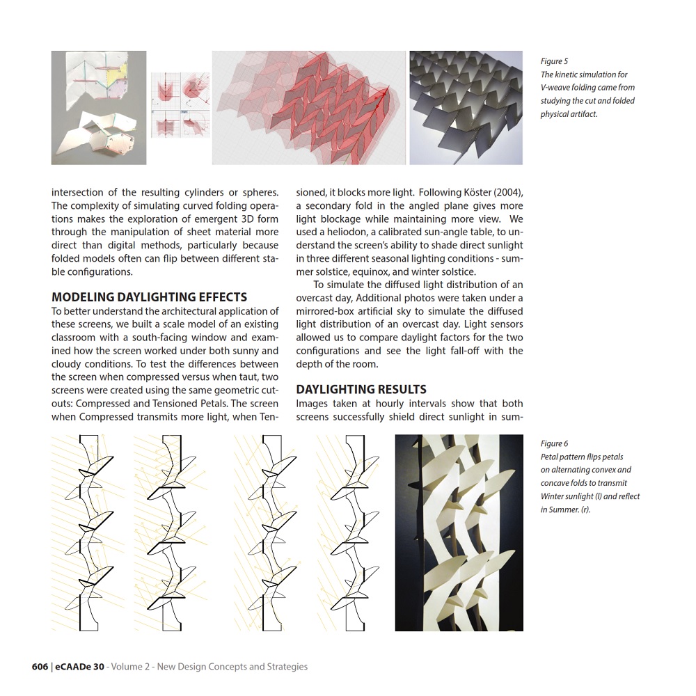 This paper by Nancy Yen-wen Cheng analyses a hybrid design approach; how physical and digital processes can inform each other in a multivalent design cycle. It describes the design of origami-inspired window shades, part of the Shaping Light project that explores how adjustable surface structures can modulate light levels and heat gain in response to the changing seasons. The screen uses sloped surfaces to diffuse light and create apertures that close when the screen is stretched and open when the screen is folded.